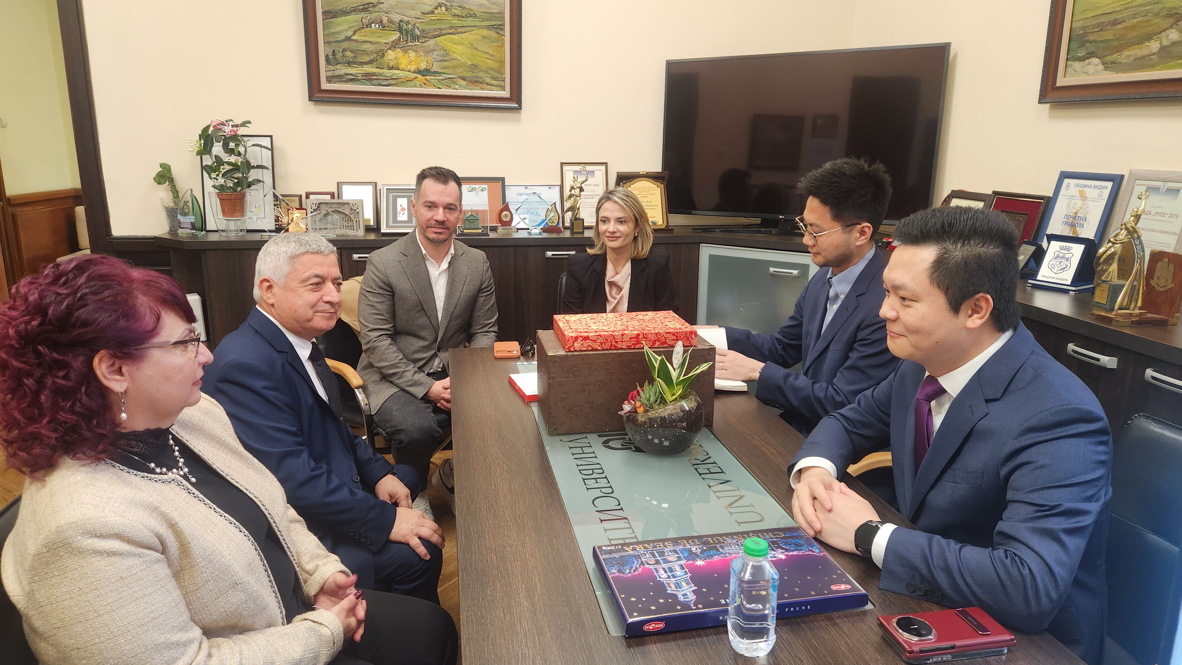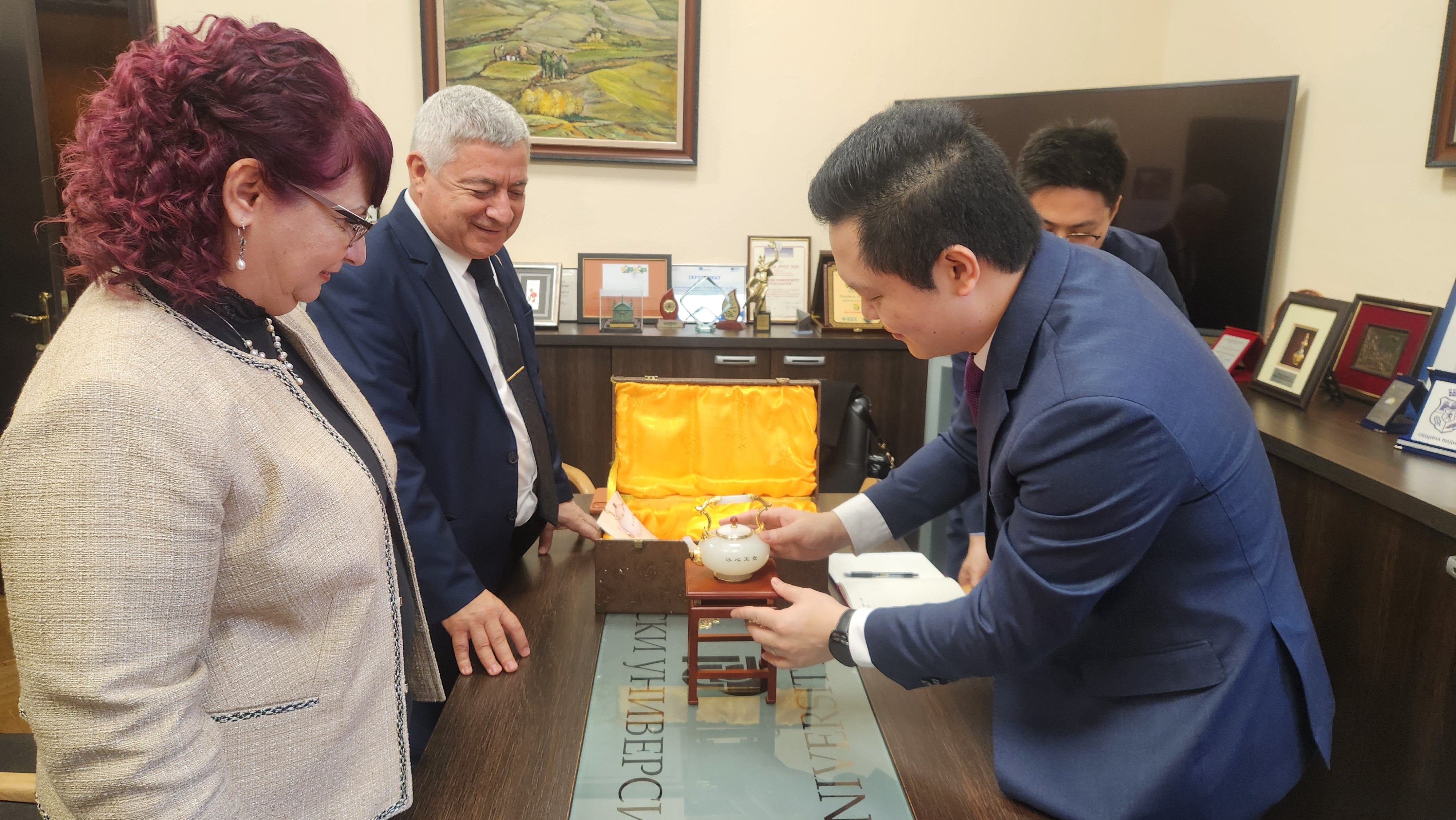 On the occasion of the 80th anniversary of the University of Ruse, Mr. Li Dzemin presented Academician Beloev, DscEng and Assoc. Prof. Atanasova, PhD with a handmade Chinese teapot made of white jade - a stone for inner peace and higher consciousness, which symbolizes purity, clarity and wisdom. At the end of the meeting, he invited the university representatives to visit the company's development centres in China.