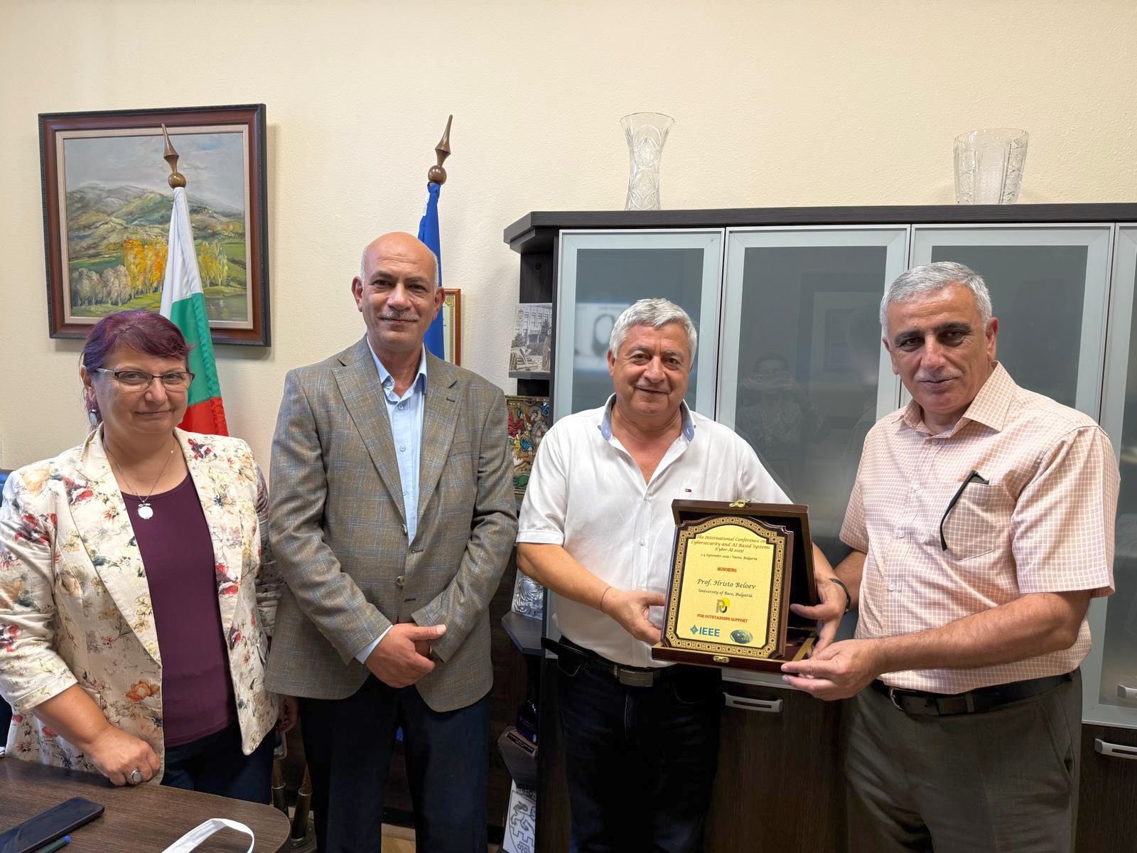 During their visit, the lecturers from the Kingdom of Jordan met with the Rector of Ruse the University of Ruse, Associate Professor Desislava Atanasova, PhD and the Honourary Rector and Chairman of the General Assembly of the University, Academician Hristo Beloev, DscEng who were awarded plaques of gratitude for the long-standing cooperation between the two institutions and for the support of the University of Ruse in organizing and conducting the international scientific conferences CYBER-AI 2025, ICCNS 2025, and IDSTA 2025.