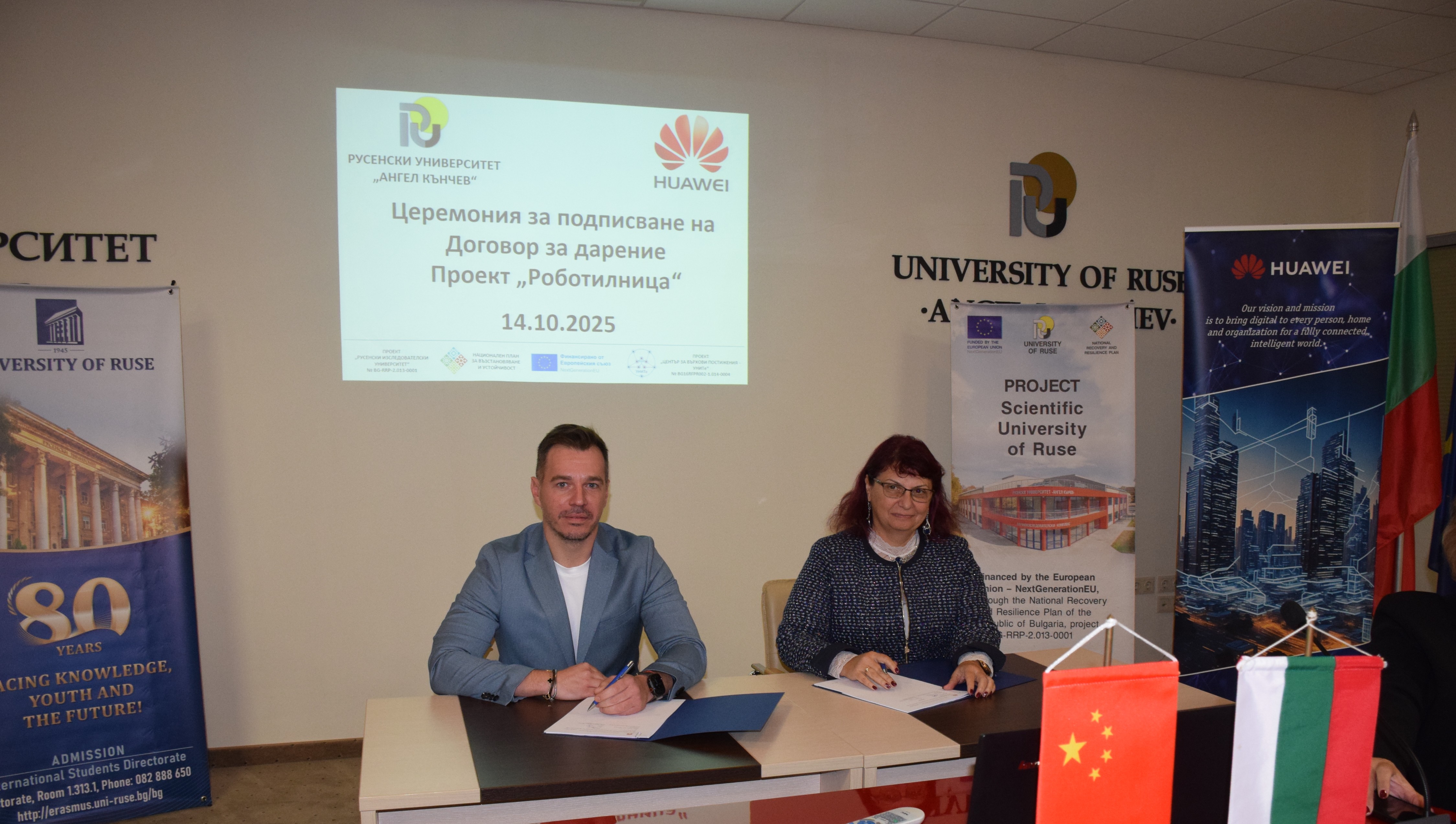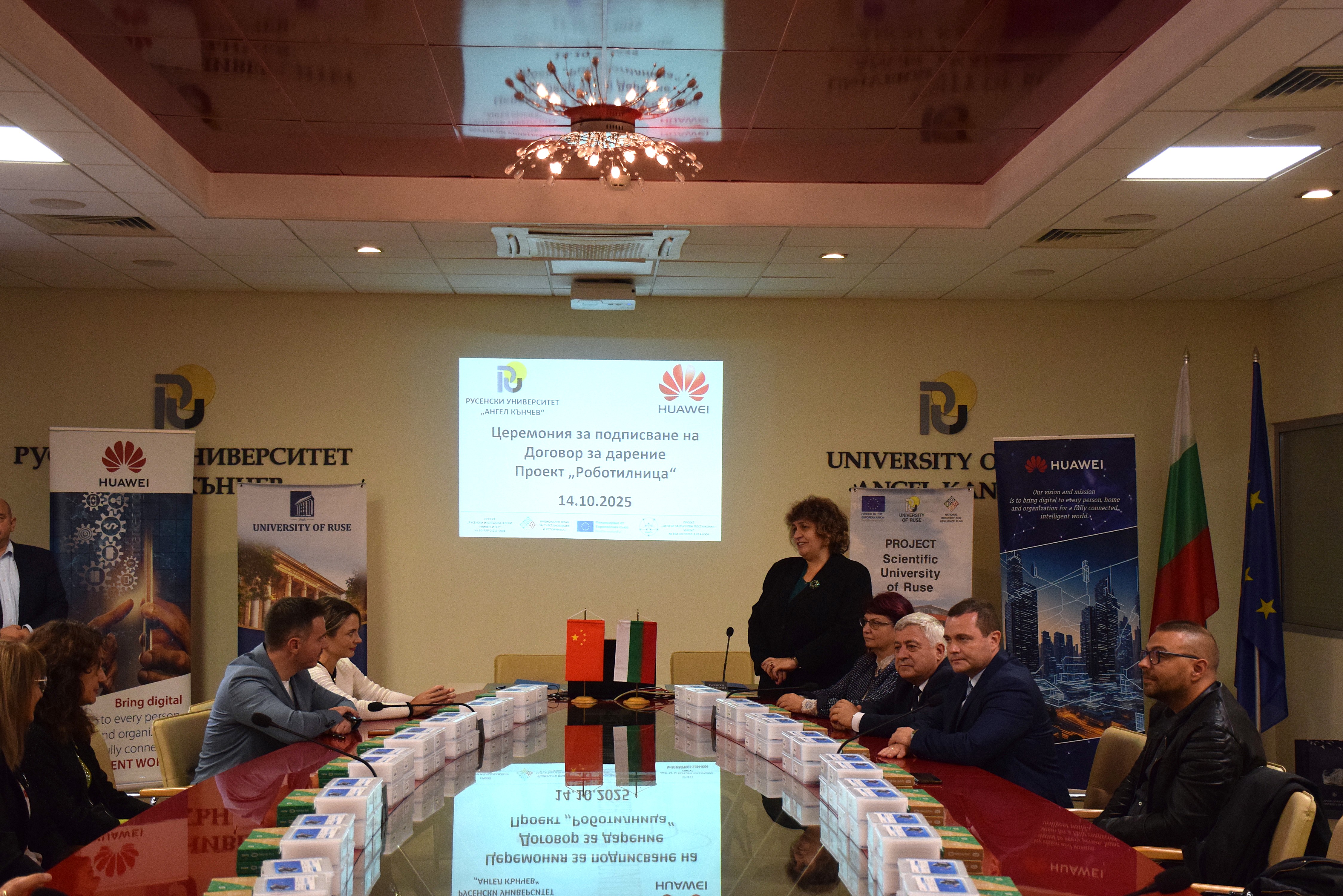 On November 12th , 2025, a meeting was held between the management of the University of Ruse and Huawei Technologies Bulgaria EOOD. The meeting was attended by the rector of Assoc. Prof. Desislava Atanasova, PhD and academician Hristo Beloev, DscEng - honourary rector and chairman of the General Assembly of the University of Ruse. and the technology giant was represented by Mr. Li Zemin, General Manager of the company for Bulgaria, Mr. Chris Hu, Director of the Corporate Clients Division, Mr. Ruslan Tsankov, Key Account Manager and Ms. Raya Guncheva, Public Relations Manager.