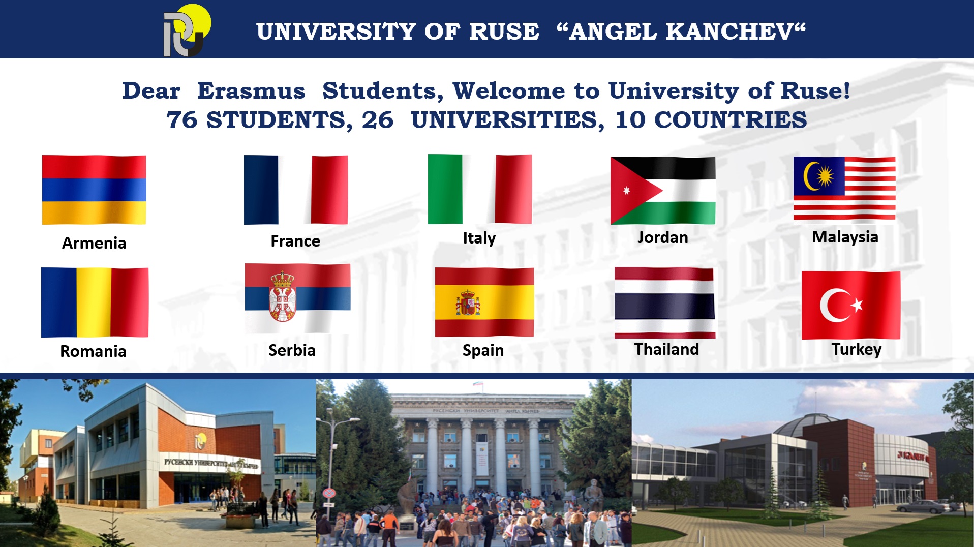 During the winter semester of the 2025/2026 academic year, the University of Ruse will welcome 76 Erasmus+ students from 26 universities in 10 countries – Armenia, Italy, Spain, Jordan, Malaysia, Romania, Serbia, Thailand, Turkey, and France. They will study at the university for one or two semesters. During the same period of the previous academic year, 70 students from ten countries were welcomed.